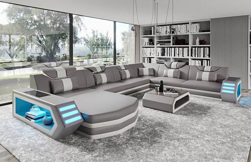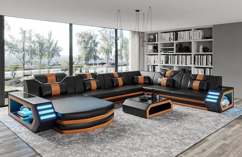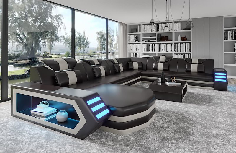 2021 Hot sale high quality LED U shape home furniture modern design living room black color leather