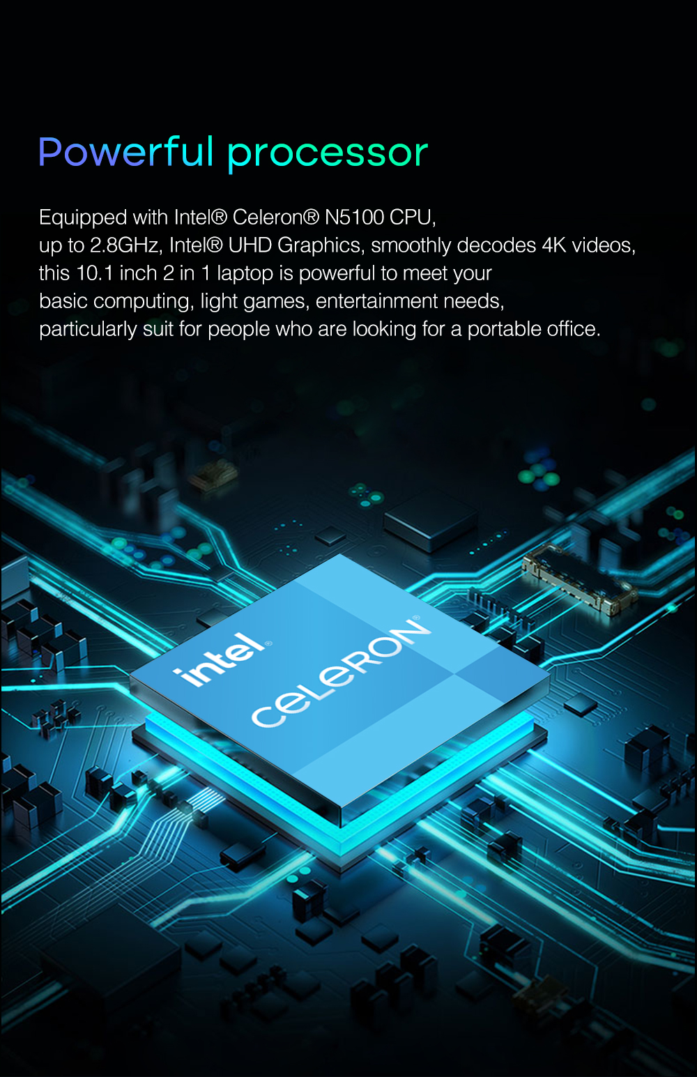 Intel Celeron N5100, 4 cores, 4 threads, 10nm process, up to 2.8Ghz