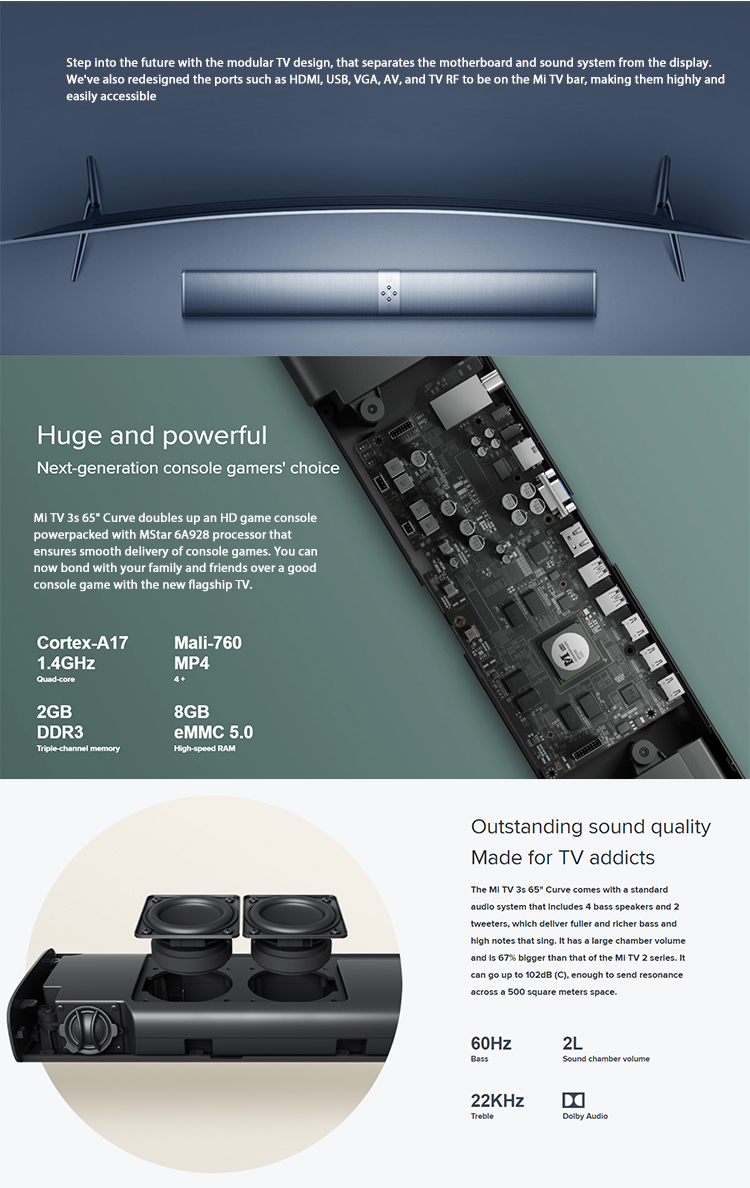 Immerse in pure TV entertainment. The Mi TV 3s 65" Curve is a work of art that fits beautifully in your living room. Includes an utra-thin 4K curve display, 4000R gold curvature, and a standalone audio system to enhance your viewing experience.