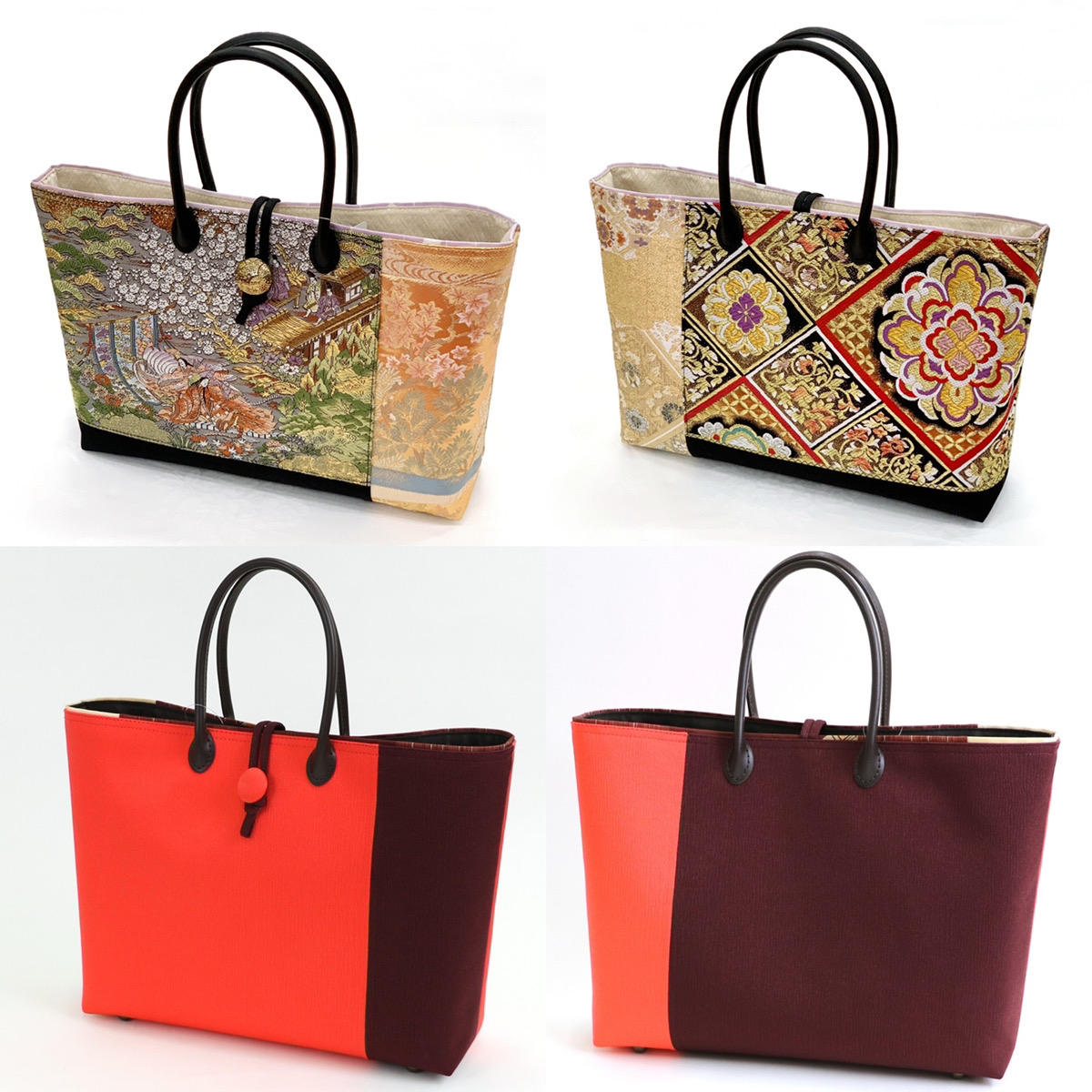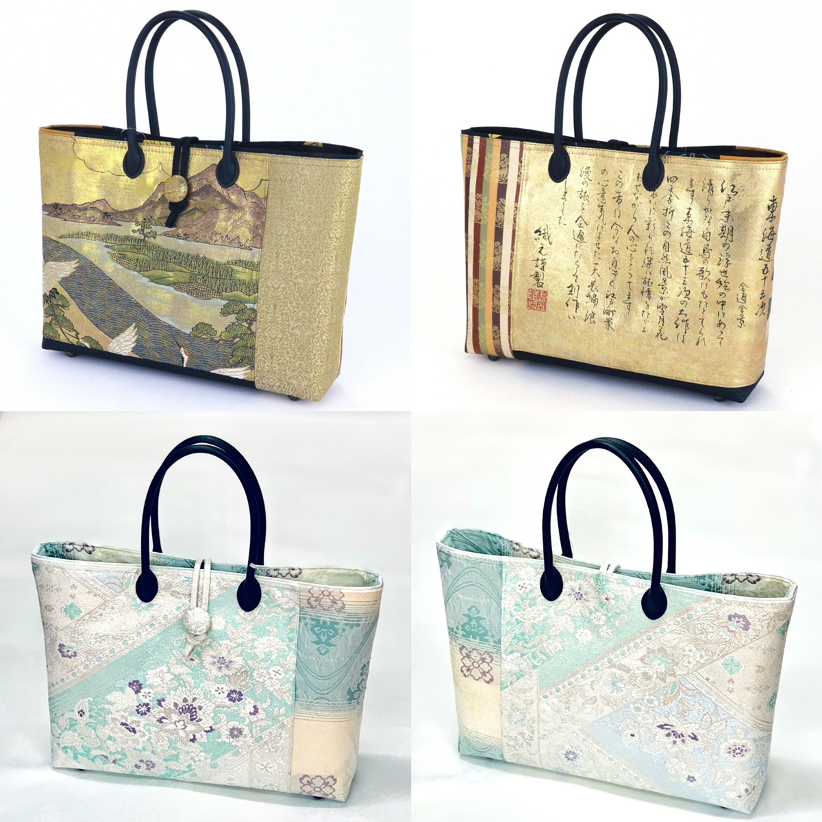 ONLY HERE!!! Shitateya Jingoro original bag collection, made from kimono fabrics and silk obi fabrics. Various types of bags are available for different occasions. All bags can be zippered. 【Highest class “JIN-bag”】 •Luxurious bag made of the finest pure silk fabric or phantom fabric made of “Nishijin-Obi” fabric or Shitateya Jingoro's original fabric (Sakiko). •The inside of the bag is also made of kimono fabric •It has pockets for small items. •It has bottom studs to prevent staining •Original charm included •Fits A4 size files and plastic bottles •Lightweight and easy to hold •The handle is made of fine leather.
