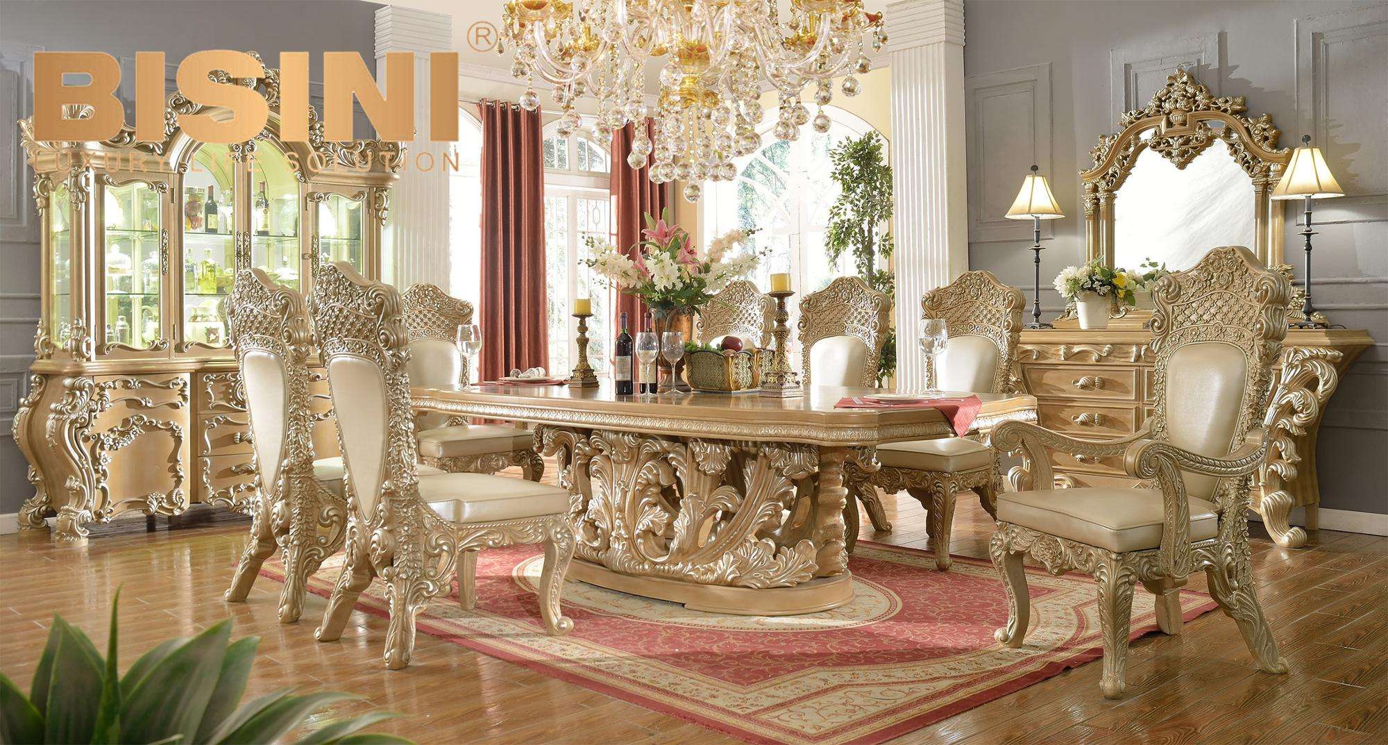Luxurious Champagne Gold Silver Leaf Rectangle Hand Carving Dining Table Set Royal Home Furniture