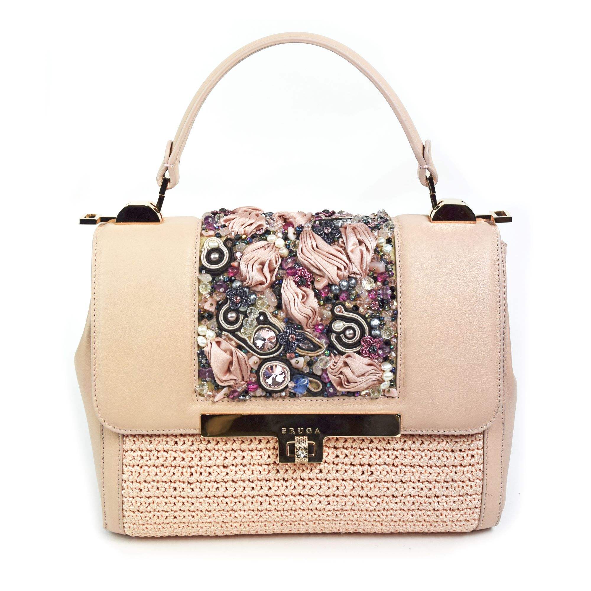 Bovine leather mousse and hand made crochet jewel bag, embroidered with precious elements. Jacquard interior. Diamond-effect turn lock with a stone set in it. Customized silver plaque on demand.