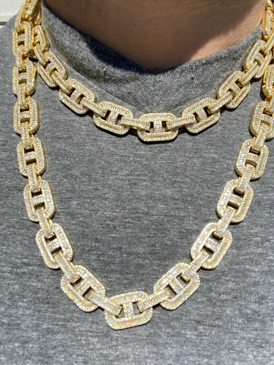 Ritzin 14k Yellow Gold Over Baguette Shape Moissanite Diamond Link Chain Iced Out Bling Jewelry Chai