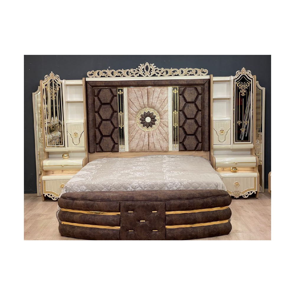 Set content (9-11 pcs): 1. Bedstead with automatic base 2. Wardrobe 3. Left nightstand, 4. Right nightstand, 5. Dresser 6. Chest drawers 7. Decorative pier glass mirror 8. Ottoman bench 9. Puff 10. Additional cabinet (optional) 11. TV unit (optional)