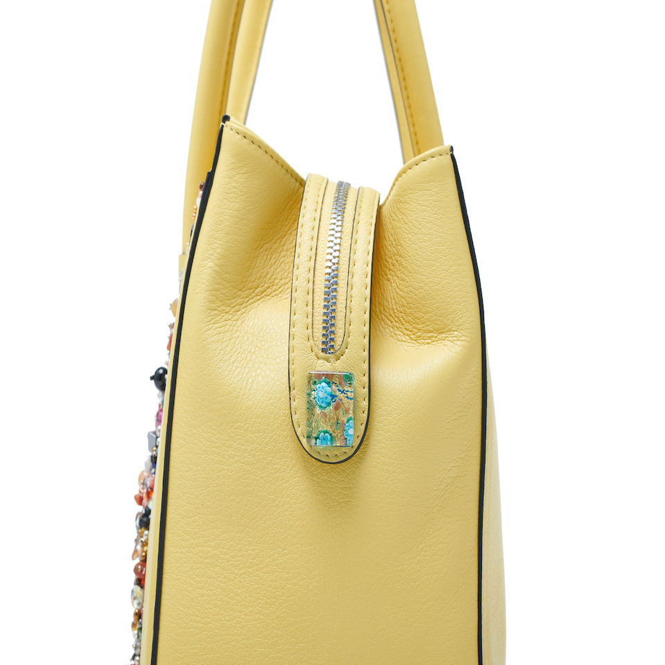 Bovine leather mousse shopping bag with embroideries and glass decorations. Jacquard interior. Customized silver plaque on demand.